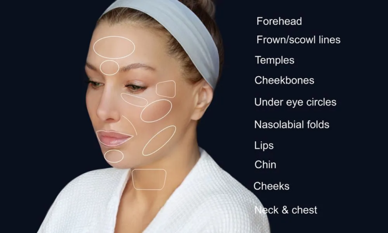 Nasolabial folds, marionette lines, cheek volume loss, under-eye hollows, and jawline definition.